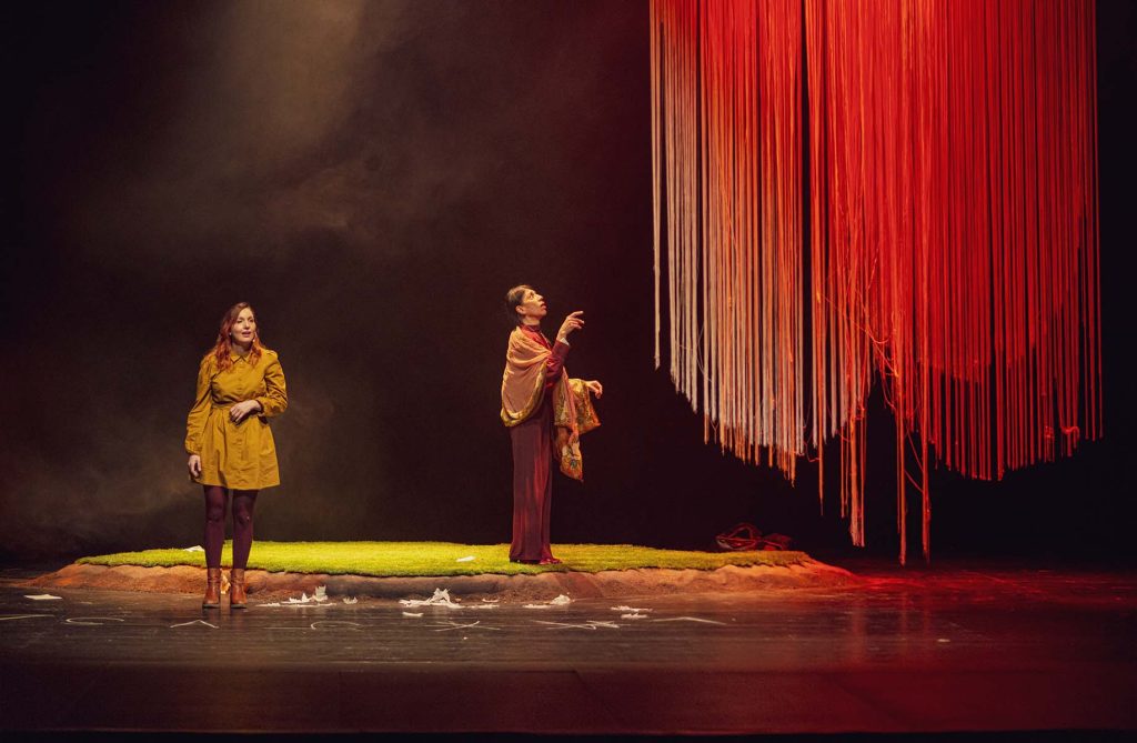 Hay muchas capas de realidad en este relato aparentemente caótico. Los saltos en el tiempo ayudan a confeccionar el mosaico de la quebrada línea temporal y aflora el relato de pasajes de indigesta asunción. El escenario es sumamente sencillo, con parcela de césped, cortina de flecos y humo. La iluminación y los espacios sonoros colaboran en la construcción de atmósferas y momentos. Mónica Bardem y Carmen Ibeas interpretan ese duo femenino y, como Don Quijote y Sancho, intercambian posiciones, opiniones y papeles en su proceso de construcción dramática. Su final, muy largo, ahonda en momentos de estatismo y repetición obsesiva.