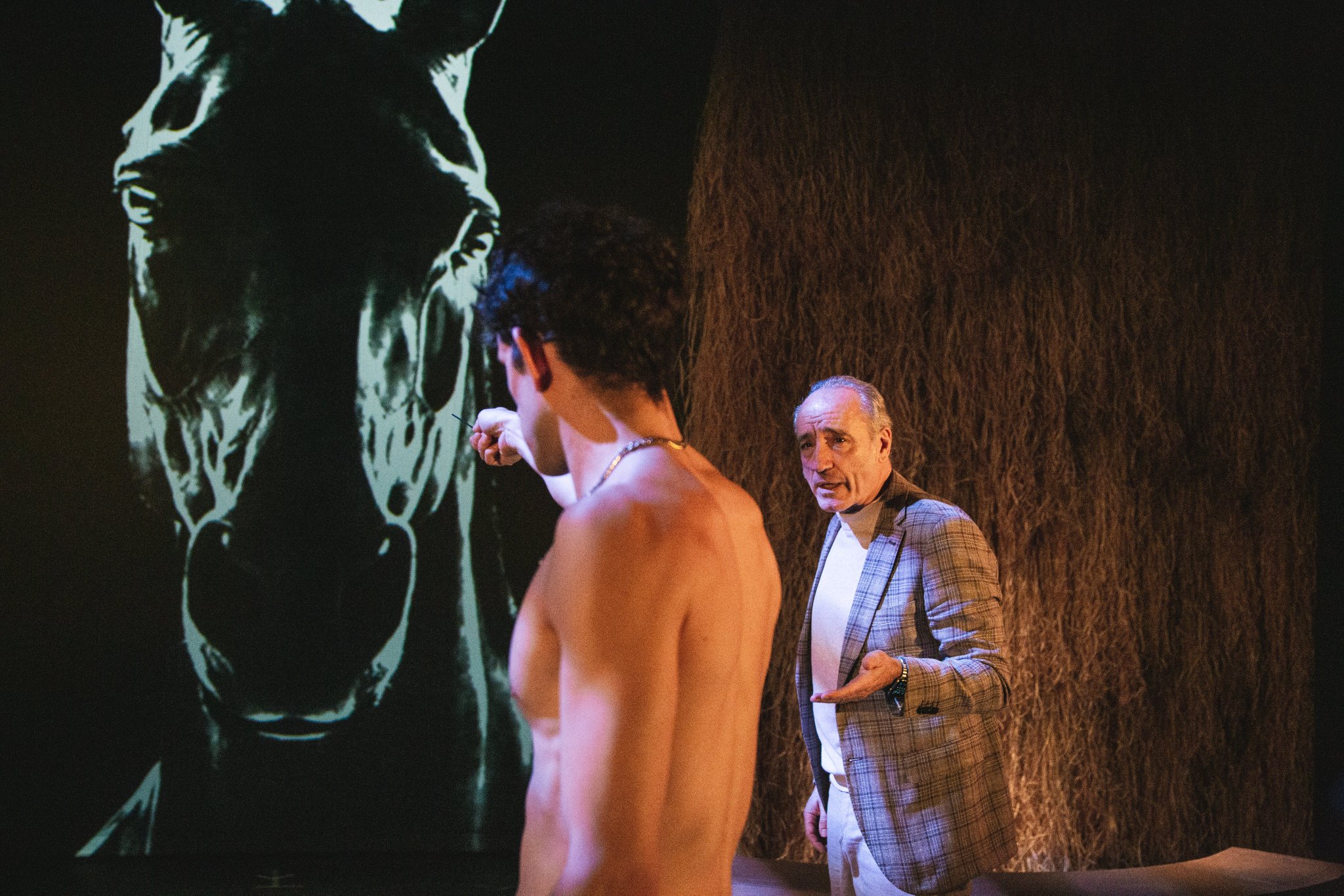 Carolina África se atreve a retomar y dirige esta apuesta. El montaje es fiel al guion original y retoma icónicas caracterizaciones, sobre todo de los caballos, con lo que en su momento supuso una rompedora apuesta para los más clásicos de la escena. Todo en su momento contribuyó al escándalo, desde la inclusión de desnudos hasta la explícita narración de escenas de sexo, desde la violencia hasta las alucinaciones oníricas. Este montaje mantiene todo ello y no supone ya causa de nada. El reparto carga con soltura con el peso de interpretaciones que aún no se han olvidado y defienden sus papeles eficazmente. Roberto Álvarez ha desarrollado su papel de médico hacia territorios de mayor intimidad y credibilidad moderando registros. Álex Villazán despliega energía en el papel de Alan Strang, el joven paciente, con decibelios y timbre no siempre controlados. Manuela Paso es una garantía de solvencia en cualquier interpretación que afronte. Claudia Galán y Jorge Mayor completan este elenco y lo dotan de matices interesantes. La escenografía incluye proyecciones, efectos especiales, sonido e iluminación que actualizan la eficacia de las propuestas escénicas más artesanas del pasado.