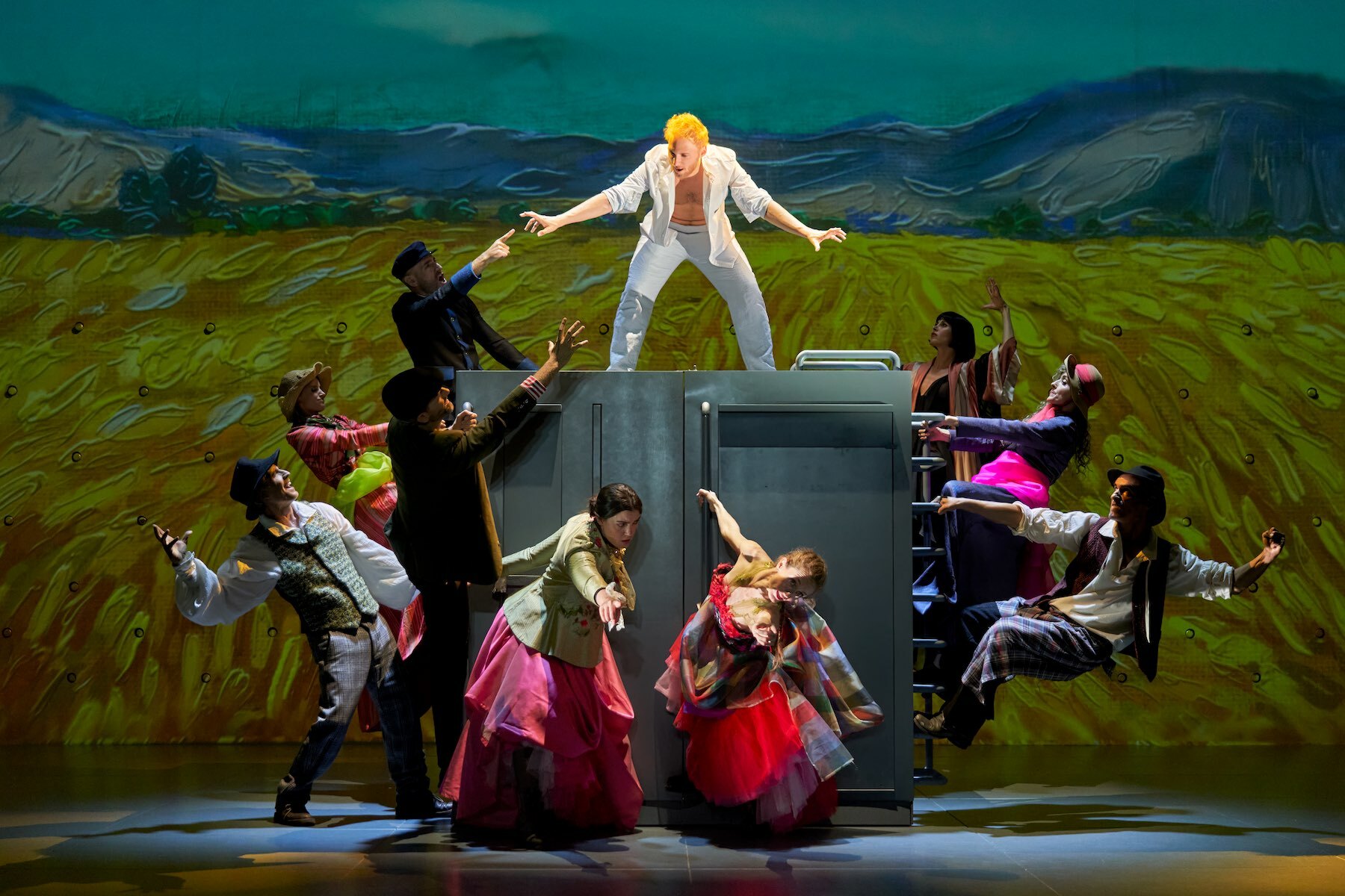 La escenografía de Alessio Meloni está cimentada en la incorporación de la inteligencia artificial. Mediante proyecciones se asiste a la génesis de la obra artística, la adición de planos y el relato creativo de la misma, además de la transcripción del pensamiento y la ilustración de obras concretas. Se rompe la tradicional frontera entre escenario y patio de butacas, cada una de las cuales enfundada en una chaqueta, y toda la sala envuelve inmersivamente al espectador en una experiencia global de los sentidos y las emociones. Un muy versátil cubo giratorio sirve de atalaya, soporte y contenedor en el escenario. Los decorados y los espacios sonoros y lumínicos sorprenden por la calidad, variedad y por su diseño estético como complemento de la acción y su relato. Mientras la música de Ara Malikian hace vibrar cuerdas y corazones, la coreografía de Chevi Muraday asume el relato inefable de aquello vetado a las palabras. Pier Paolo Álvaro suma su conocimiento y su buen hacer con el diseño de un vestuario rico y coherente.
