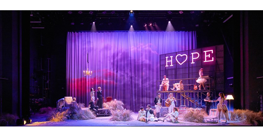 La dirección de Lluís Homar intenta poner orden y sentido en el despliegue de esta obra. Diversos escenarios coexisten y el movimiento escénico ha de ser eficazmente coordinado. Así es. La escenografía inicial de Jose Novoa, rompedora en su actualización, recrea un espacio abierto a las afueras de la ciudad con un neón, un crucero de piedra, butacas de playa y setos móviles, con evocaciones estéticas de ruta 66 y Bagdad Café. Se pasa a los ambientes privados con un estrado giratorio y a los más privados aún tras una cortina/visillo que deja adivinar lo que sucede. La iluminación y el vestuario no renuncian a las esencias clásicas, pero incorporan elementos de modernidad iconoclasta. Este montaje incluye la música de Marc Servera y una canción en catalán, en interpretación de la misma Joven Compañía. Los acordes no asfixian ni entorpecen la acción; colaboran a crear ambientes y visten las transiciones entre escenas. Se invita a un recorrido por distintos aires: son cubano, disco, balada, para terminar en la fiesta total de tantas películas rellenando la siempre apresurada manera de firmar finales de los clásicos.