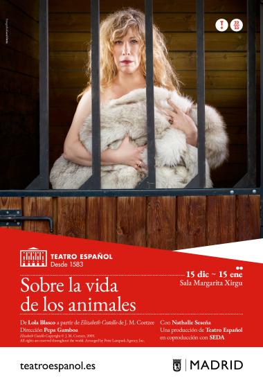 Sobre la vida de los animales es una producción de Teatro Español y SEDA con texto de Lola Blasco, a partir de la obra original Elizabeth Costello de J.M. Coetzee, dirigida por Pepa Gamboa, protagonizada por Nathalie Seseña, con diseño de espacio escénico de Antonio Marín, diseño de espacio sonoro y composición musical y audiovisual de Ignacio Ysasi, diseño de iluminación de Juanjo Llorens, diseño de vestuario de Pier Paolo Álvaro y Roger Portal y coreografía y movimiento escénico de Zoe Sepúlveda.
