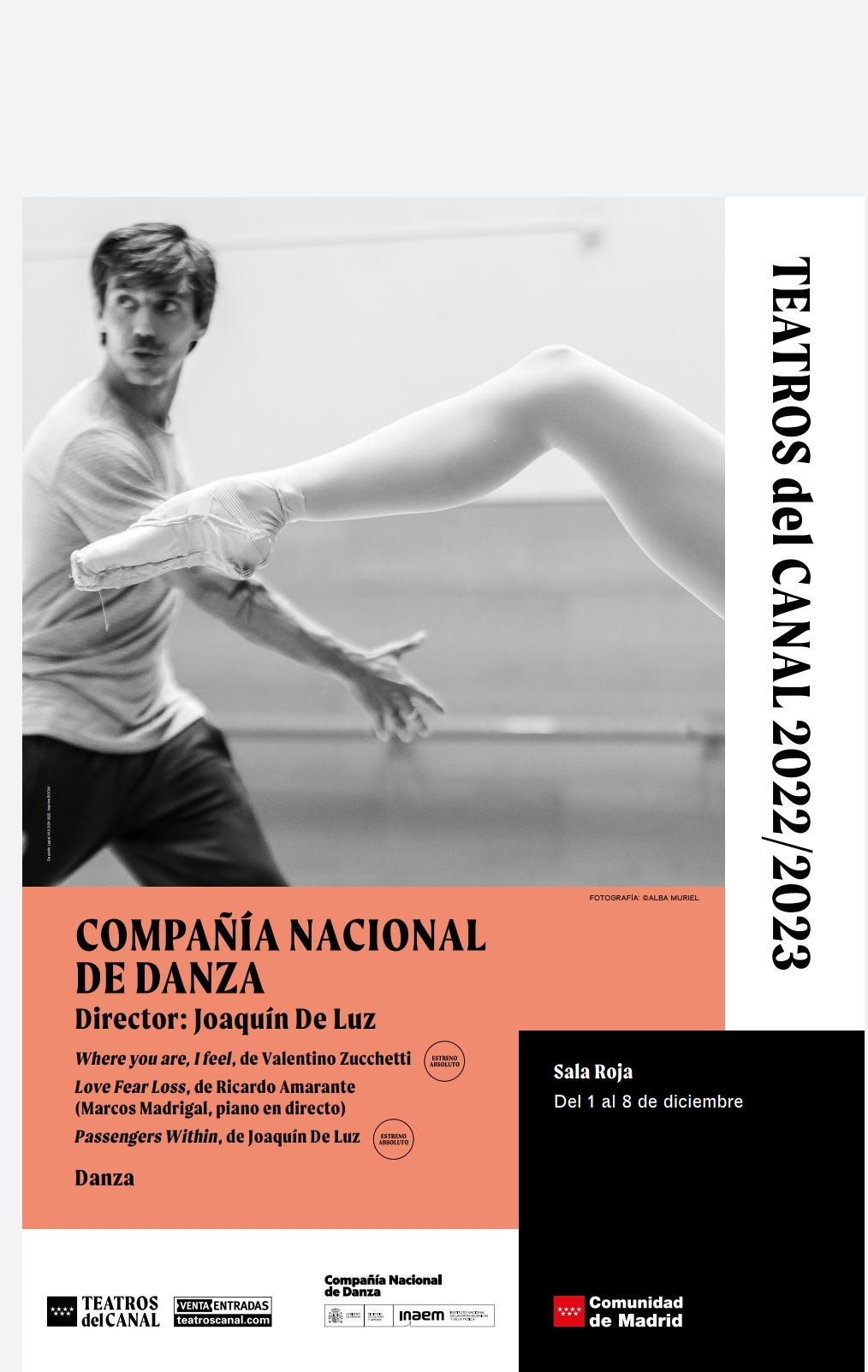 La Compañía Nacional de Danza dirigida por Joaquín De Luz regresa este jueves a los Teatros del Canal con un programa triple que incluye dos estrenos absolutos. El espectáculo estará dividido en tres piezas: el estreno absoluto de Where you are, I feel del joven coreógrafo Valentino Zucchetti con música de Edvard Grieg; a continuación Love Fear Loss de Ricardo Amarante con música de Edith Piaf, Jacques Brel y Charles Dumont, y con el pianista Marcos Madrigal en directo; y para cerrar el estreno también absoluto de Passengers Within, del director de la CND, Joaquín De Luz, con música de Philip Glass.