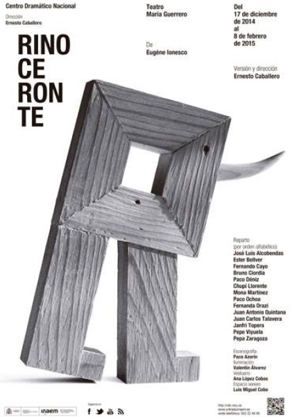 Rinoceronte, escrita por Eugène Ionesco en 1959 es una fábula dramática acerca de la propagación y aceptación social del totalitarismo. La acción transcurre en una pequeña ciudad de provincias donde un buen día aparece un rinoceronte perturbando la tranquila y burguesa vida de la comunidad y generando, como si de una epidemia se tratara, un efecto de contagio consistente en la transformación de las personas en hermosos y robustos paquidermos.