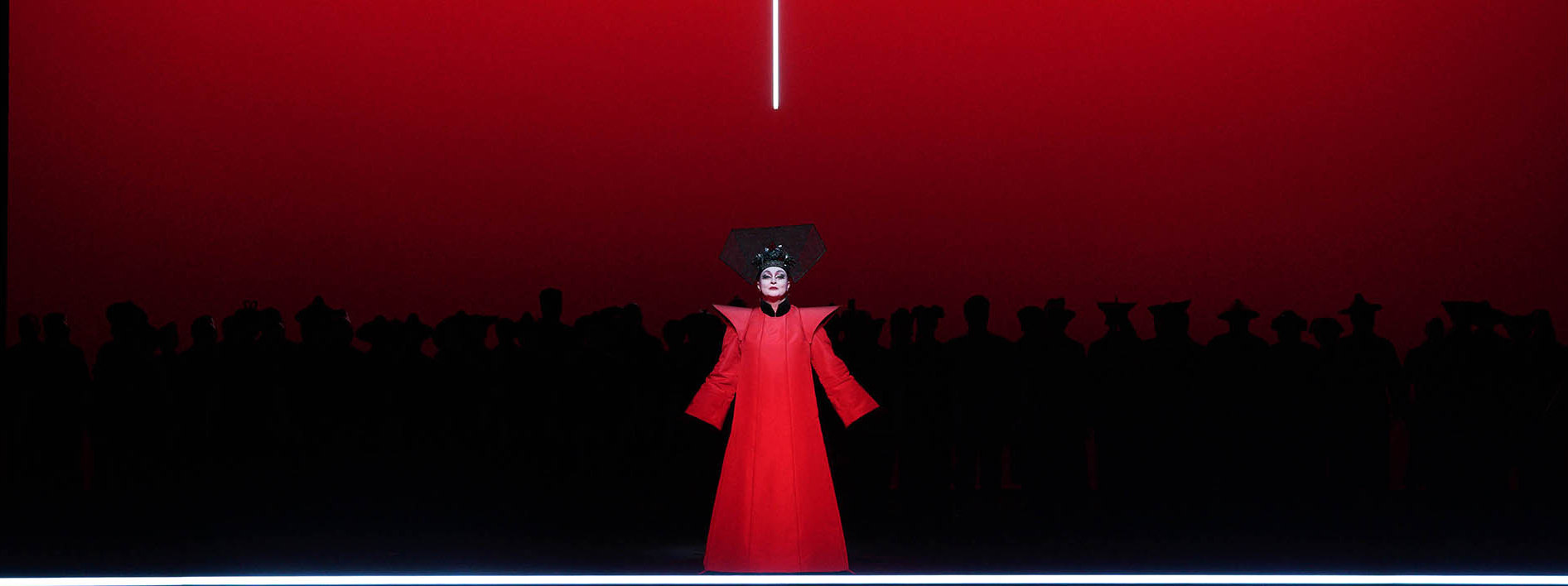 Robert Wilson, con su particular lenguaje estético y conceptual, dirige la puesta en escena, la escenografía y la iluminación y tiende a un planteamiento estatuario e inmovilista de presencias y ausencias. Él mismo declara el formalismo de su propuesta frente a aproximaciones más naturalistas Las sombras añaden tintes misteriosos a un universo temporal y espacial de remoto orientalismo envuelto en un cromatismo de semántica simbología. La pirámide de poder queda clara con un emperador que no pisa el suelo y una princesa que se presenta presidiendo la acción desde un plano superior y siempre distante. Los movimientos escénicos son necesariamente mínimos en una sociedad estamental de imposible permeabilidad y se introducen máscaras y gestos que remedan un imaginario colectivo de fácil identificación.